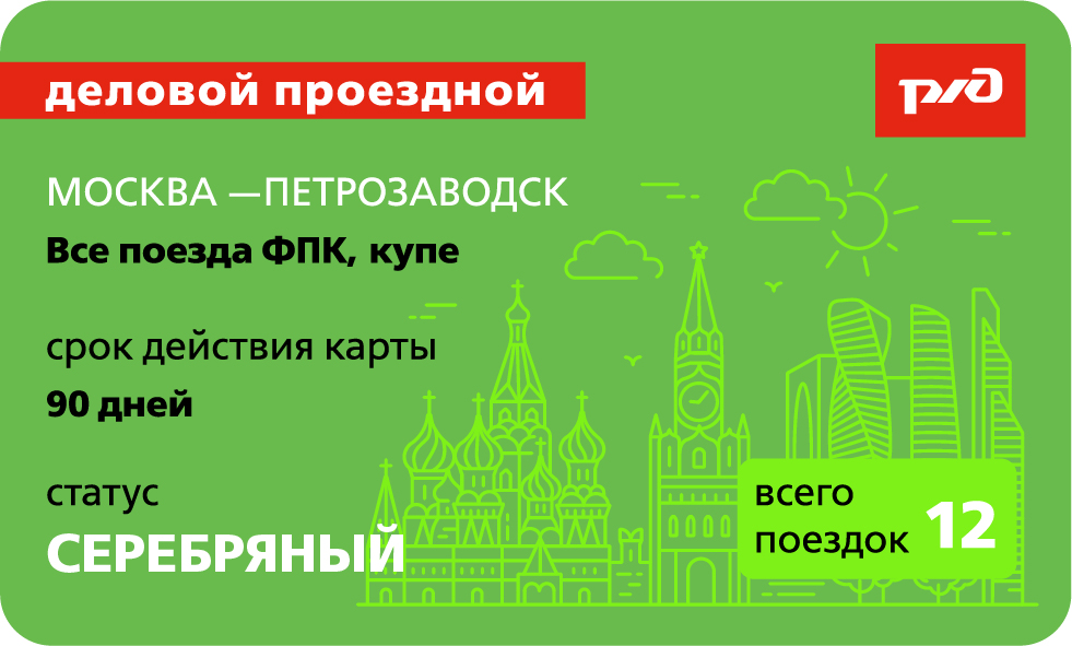 «Деловой проездной» распространяется на все поезда формирования АО «ФПК» в направлении Москва – Петрозаводск и обратно.
