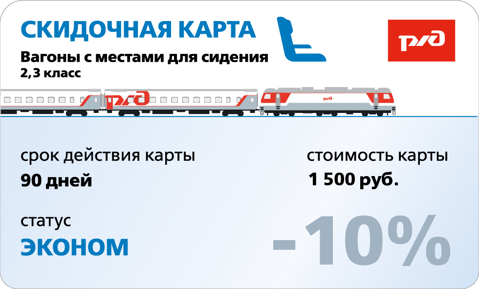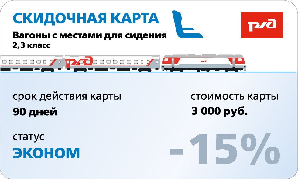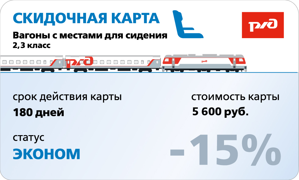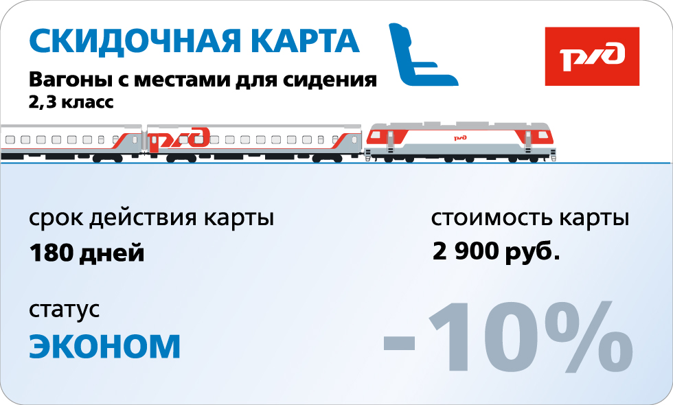 при покупке скидочной карты пассажир получает возможность получать скидки на билеты в вагоны с местами для сидения поездов дальнего следования во внутригосударственном сообщении формирования АО «ФПК»