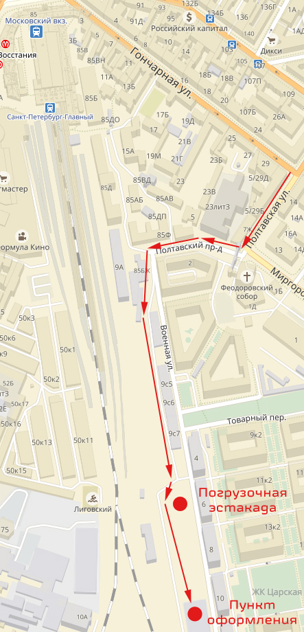 • в г. Санкт-Петербург: на погрузочную площадку станции Санкт-Петербург Главный по адресу: Невский проспект, д. 85, строение 15 (схема проезда). В связи с установленным пропускным режимом на станции Санкт-Петербург Главный, для прохода/проезда на территорию погрузочной площадки, необходимо заранее заказать разовый пропуск, обратившись по телефону: +7 (812) 457-95-57 с 08:00 до 19:30;