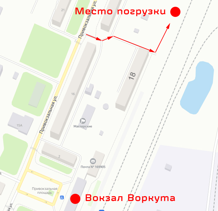• в г. Воркута по адресу: ул. Привокзальная, д. 18, на погрузочную площадку станции Воркута, расположенную на пути №21с (схема проезда).