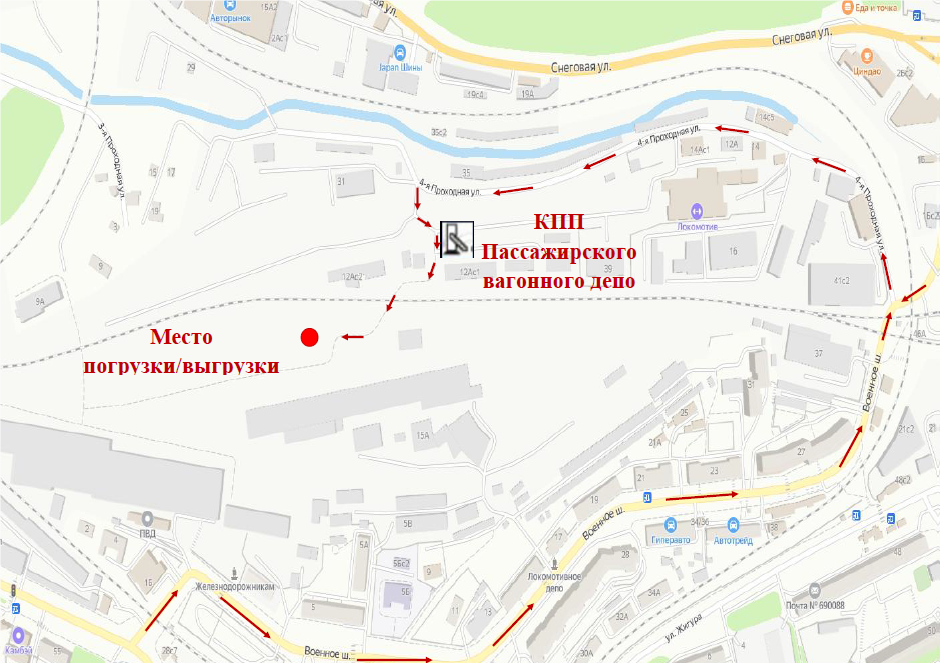 • в г. Владивосток по адресу: ул. Военное шоссе, дом 1А, (пункт пропуска со стороны улицы Проходная-4), на погрузочную площадку станции Первая Речка (схема проезда).